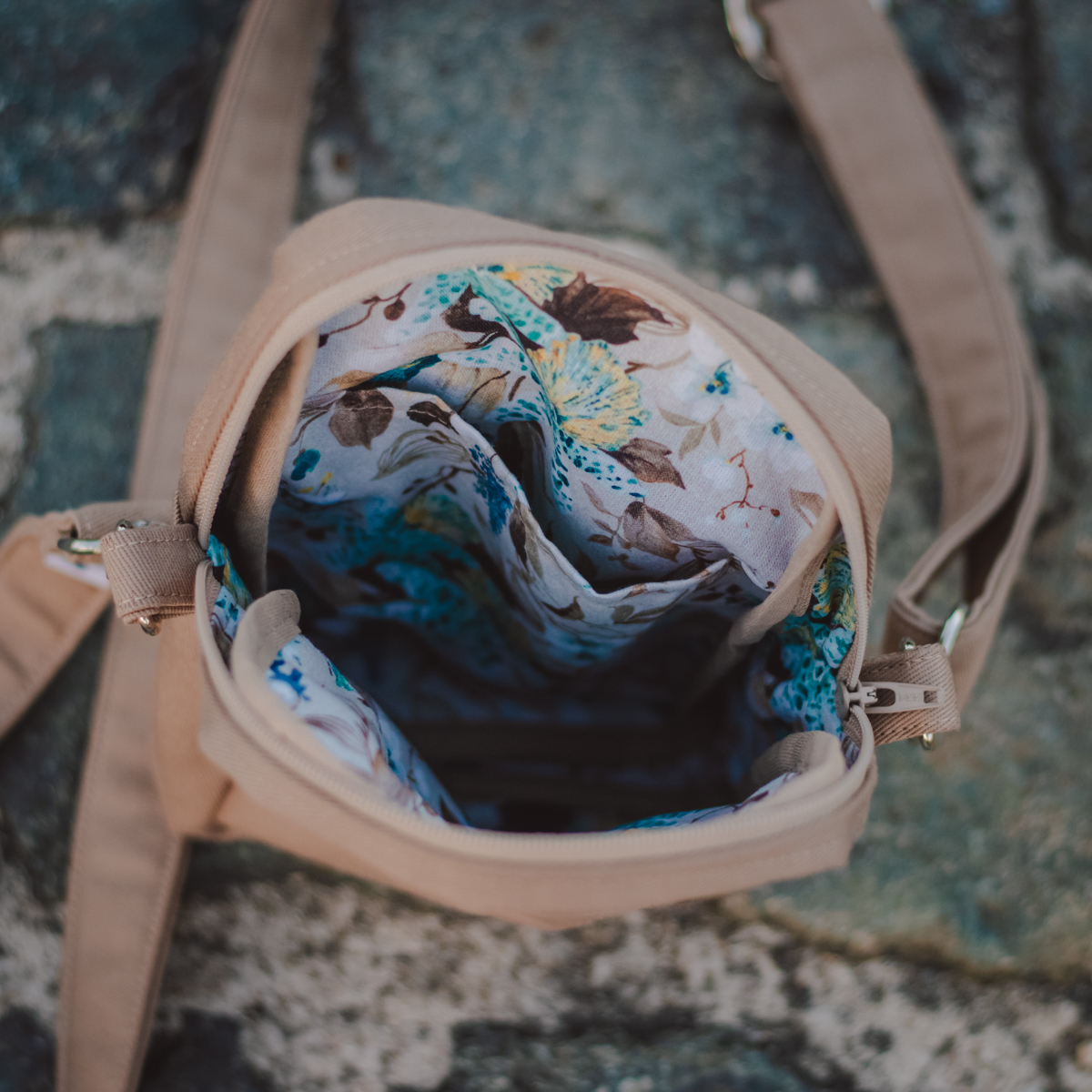 Opgelet: dit wandeltasje kan niet super laag gedragen worden, gezien de schouderriem iets korter is uitgevallen dan gebruikelijk. Wens je foto’s of afmetingen? Stuur gerust een mail.